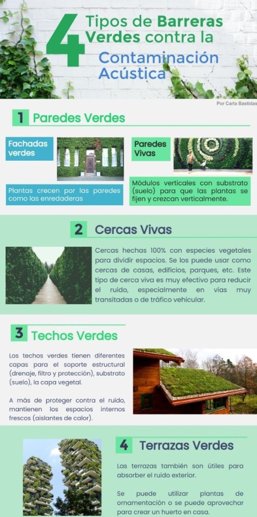 Estudios han mostrado que la mecánica vibracional de las plantas provocada por las ondas acústicas, permiten que la energía del sonido se convierta en calor. Además, la presencia del suelo o tierra bloquea las frecuencias bajas de sonido, mientras que las estructuras vegetales las frecuencias altas (Azkorra y Urrestarazu, 2015). En el siguiente infograma se muestra los tipos de barreras verdes que se pueden utilizar para minimizar los impactos del ruido.